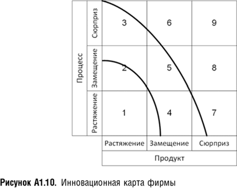 На рис. A1.10 представлена карта инноваций компании: продуктовые инновации соотнесены с процессными. В том случае, если новый продукт нельзя изготовить по существующей производственной технологии, для продуктовой инновации потребуются соответствующие изменения в процессах. Например, инновации в области разработки интегральных схем идут параллельно с инновациями в их производстве (установки последовательного шагового экспонирования). Такие «сдвоенные инновации» возможны в ячейках 1, 5 и 9 на рис. А1.10. Инновации, расположенные вдоль вертикальной оси на рис. А1.10, обычно проходят более плавно (и являются менее рискованными), чем инновации, отмеченные по горизонтальной оси. Инновации в ячейке 1 касаются улучшений продукта и/или процесса. Они необходимы, хотя и не слишком влияют на конкурентоспособность компании. Устойчивое конкурентное преимущество возникает благодаря созданию аналога существующего на рынке продукта с помощью замещающего или даже революционного технологического процесса (инновации в ячейках 2 и 3), но это сопряжено с дефицитом времени, поскольку конкуренты могут двигаться в этом же направлении. Незапланированные продуктовые инновации (сюрприз) нередко требуют соответствующих инновационных процессов; они располагаются в ячейках 7 и 8. Построение диаграммы основных инноваций компании в матрице, представленной на рис. A1.10, не только дает ее генеральному директору четкое представление об их природе и сопряженных рисках, но и может помочь при выборе руководителя конкретного уровня в качестве ответственного за тот или иной инновационный процесс. Две гиперболы делят матрицу на три части. Инновации в левой части относятся к сфере ответственности руководителя производственной деятельностью компании. Инновации между двумя гиперболами относятся к сфере ответственности руководства бизнес-единицами. Инновации в верхней правой части матрицы – революционные инновации, не связанные с существующим бизнесом. Они относятся к сфере ответственности высшего руководства до тех пор, пока на их основе не образуются новые бизнес-единицы.