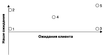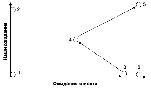 В этой плоскости (рис. 2.9) нередко начинают с хода 1 ? 2. Что это значит? Насилие над клиентом. Во что бы то ни стало «втюхать», «втюрить» ему свой продукт или услугу. Удовлетворить свои ожидания, а там – хоть трава не расти. Итак, назовем точку 2 «точкой насилия».
