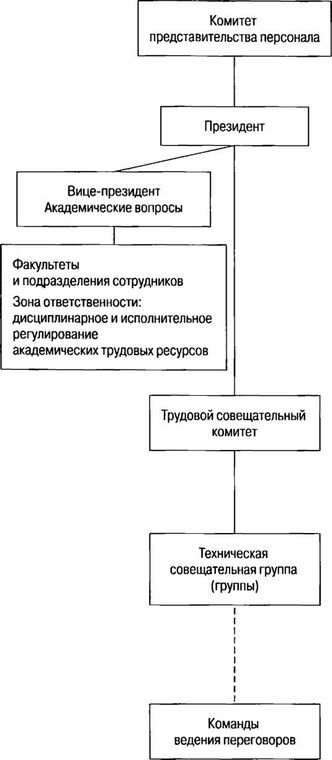 Рассмотрим такой пример: один человек среди прочих функций несет ответственность за трудовые отношения в огромном Иезуитском университете, в котором и преподавательский, и вспомогательный персонал представлен членами профсоюзов. С одной стороны имела место тенденция к централизации переговорных процессов в сфере трудовых отношений, а с другой — осуществлялся контроль жалоб сотрудников и других вопросов, связанных с трудовыми договорами. Однако коллективные переговоры были довольно проблематичным делом в этом академическом учреждении. Во-первых, проблему обычно составлял подбор сотрудников, которые должны были подходить профессионально и в то же время быть членами профсоюза. Университет постоянно находился в состоянии финансовой нестабильности, а потому был под определенным давлением в области финансовых расходов; в то же время он располагался в городе с сильным влиянием профсоюзов, а значит, не мог пренебрегать их требованиями и при этом пользоваться поддержкой общественности. Лидеры Иезуитского университета испытывали противоречивые чувства к профессиональным союзам, вынужденные сотрудничать и идти навстречу членам профсоюзов, в то же время испытывая строгие ограничения бюджета. Так как большую часть бюджета университета составляли заработные платы сотрудников и значительное количество работников были членами профсоюза, то человек, ответственный за регулирование трудовых отношений, должен был иметь в своих руках значительную власть. Однако если бы этот человек повел дела не так, как следует, то он стал бы мишенью для многих, ведь всегда по крайней мере один участник переговорных процессов неизбежно остается недоволен их результатами. Как мог бы этот человек использовать изменение структуры, чтобы обезопасить себя и свои интересы?