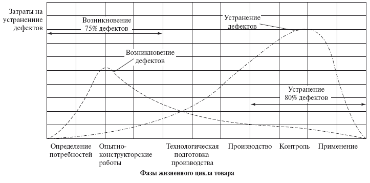 Рис. 5.8. Распределение затрат, связанных с возникновением и устранением дефектов, по стадиям ЖЦП