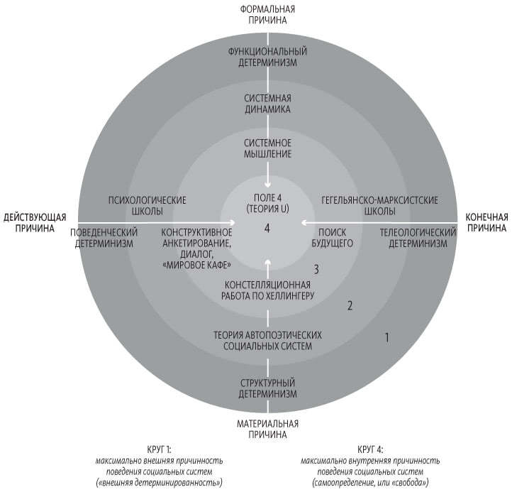 Хотя каждый подход выделяет различные основания, локус их причинности во многом совпадает: согласно всем этим теориям, он служит внешним фактором по отношению к вниманию и намерениям людей, живущих внутри системы и создающих ее. Это справедливо для всех теорий и моделей коммуникации, которые, согласно теории автопоэтических социальных систем, движут системой и воспроизводят ее. Это верно для коллективно реализованных моделей, которые, согласно теории системной динамики, управляют поведением социальных систем. Это истинно и для психологических паттернов-шаблонов, которые, согласно различным психологическим школам мышления, управляют поведением, и для объективных исторических законов, которые, согласно марксистской теории, управляют историческим процессом вплоть до его конечной стадии. Все эти теории имеют общую черту: переменные, обусловливающие изменения, служат внешними факторами в отношении внимания и намерений людей, коллективно формирующих систему. Они действуют в их слепом пятне. В этом и заключается принципиальное различие между теориями двух внешних (внешняя причинность изменений) и двух внутренних кругов (внутренняя причинность изменений). Во внутренних мы имеем дело с социальными системами, или социальными полями (как совокупностью отношений между участниками в системе), которые в состоянии увидеть себя, то есть свое слепое пятно.