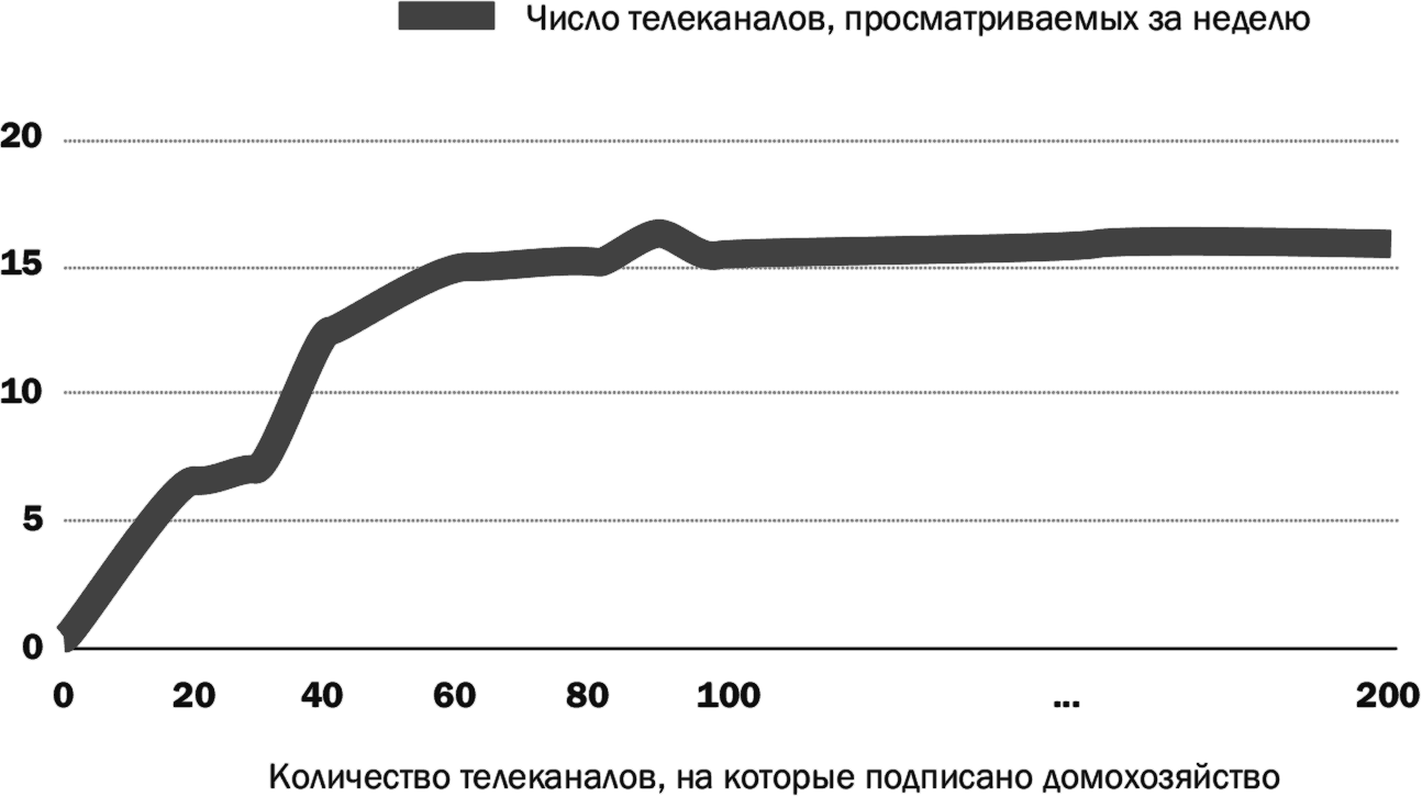 График на рис. 7.1 построен Вирджинией Бил, научным сотрудником Института Эренберга-Басса. В основу положены данные Nielsen по домохозяйствам США за 2002 год. Из графика видно, на сколько телеканалов подписаны домохозяйства и сколько из них фактически смотрят. Принципиально важный момент – насколько быстро выпрямляется график; имея подписку на 40 телеканалов, члены домохозяйства еженедельно смотрят не более дюжины из них; когда доступен просмотр 80 телеканалов, реально смотрят за неделю… чуть более дюжины каналов. Если же домохозяйство подписано на 200 телеканалов, все равно за неделю из них просматривается лишь несколько больше 12.