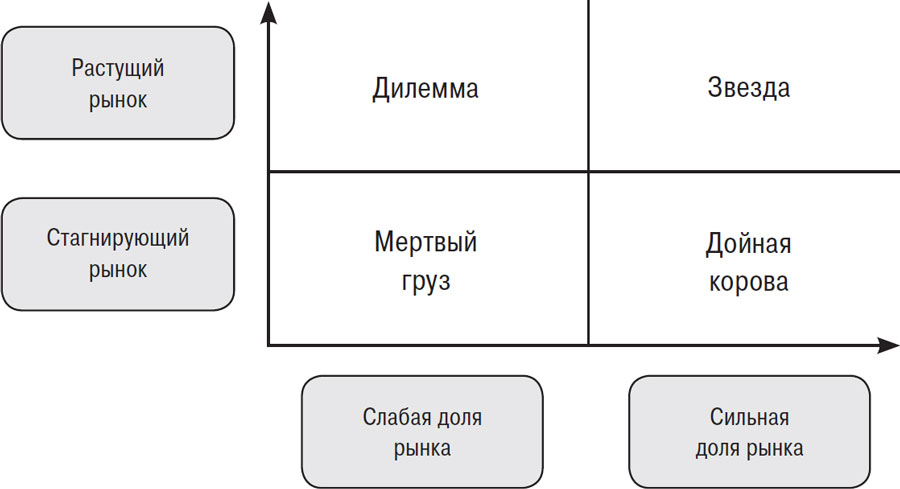 Так называемая матрица БКГ – самый известный инструмент стратегического анализа, которому обучают во всех бизнес-школах. Графически она представлена на следующем рисунке: