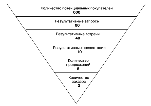 Например, в «воронке» продаж, изображенной на рис. 2.25, 600 потенциальных клиентов приводят к 60 результативным запросам. Хорошо это или плохо – 1 из 10? А как у конкурентов? Что мы можем сделать для повышения эффективности этого этапа? Может быть, изменить систему отбора потенциальных клиентов, переделать информацию для рассылки, сделать ее меньше, точнее и жестче, или более активно сопровождать все рассылки звонками конкретным менеджерам?