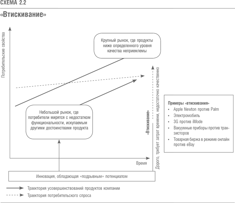 Когда признанная компания пытается встроить в свои процедуры продукт (или услугу), обладающий «подрывным» потенциалом, на выходе получается то, что ни в коей мере нельзя признать «подрывным» продуктом. Вместо того, чтобы использовать «подрывную» природу, внутренне присущую такому продукту, компания-лидер с неизбежностью пытается придать ему ту форму, которая будет соответствовать структуре процедур и ценностей компании-лидера. Компания изменяет инновационный продукт, чтобы сделать его максимально привлекательным для основных клиентов и максимально совместимым со своей бизнес-моделью. В результате инновационный продукт видоизменяется и теряет изначально присущую ему «подрывную» энергию. Мы называем это явление «втискиванием». «Втискивание» выводит инновацию из тех условий, где признаки, присущие только ей, особенно ценны, и помещает ее в тот контекст, где именно эти свойства становятся помехой на пути к успеху.