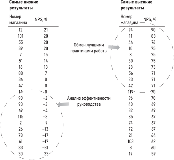 Однако существует и контраргумент. Групповое ранжирование несопоставимых бизнес-единиц приведет скорее к разочарованию, чем к положительным результатам. Даже сравнение по географическим регионам может быть сопряжено с риском, если характер бизнеса существенно отличается в разных подразделениях. Тем не менее полученные благодаря такому сравнению данные позволяют понять, в каких структурных единицах компании необходимо повысить NPS.