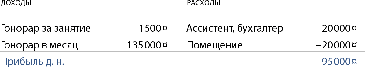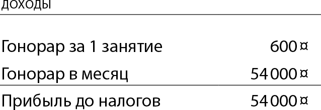Стоимость занятия: 1500 ¤. Доля Антона: 40 %. Нагрузка: 90 занятий в месяц