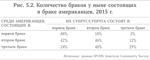 Неудивительно, что в третьем браке предпочтение отдается партнерам, также прошедшим через развод, и на фоне связанных с этим дополнительных сложностей бледнеют даже сюжеты сериала «Семейка Брейди». Чтобы разобраться, кто из чьих детей к кому из родителей приедет на Рождество, может понадобиться специальное компьютерное приложение. Последний опрос Бюро переписи населения, проводившийся в 2015 г., показал, что в парах, где для одного партнера это третий (или более) брак, второй обычно тоже был разведен.