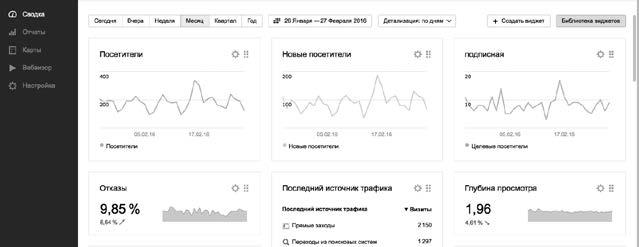 Главная страница метрики – сводка. Эта страница скорее не для глубокой аналитики, а для быстрого мониторинга ситуации. Владелец бизнеса может в любой момент зайти и увидеть, сколько сегодня было посетителей на сайте, сколько заявок, с каких источников, на каких страницах и т. д. Это окно настраивается самостоятельно с помощью виджетов. Для этого в правом верхнем углу нужно нажать «Создать виджет» и выбрать один из четырёх вариантов: