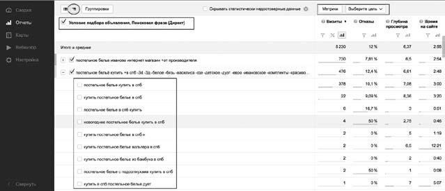 Справа расположены сами показатели. Их можно настроить, нажав на кнопку «метрики» и выбрав те, что необходимы для анализа. Стандартные – уникальные посетители, визиты, отказы, время на сайте, глубина просмотров. Кнопка «выберите цель» позволяет показать статистику по посещениям с определённой достигнутой целью. Все показатели можно фильтровать (больше, меньше, равно – как в Excel), сортировать по возрастанию и убыванию.