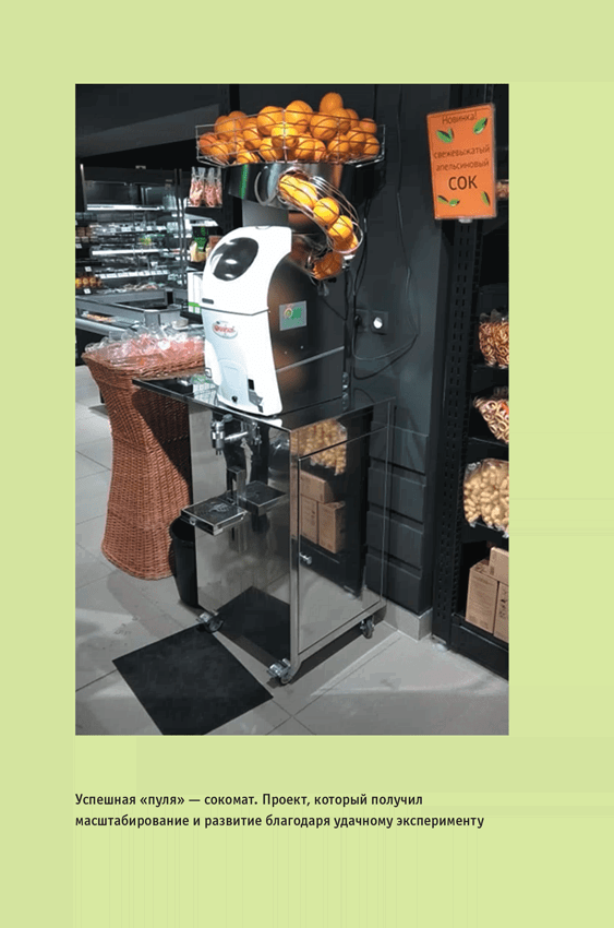 Проект уникальный для России. Ведь это не бутафорские сокоматы с уже готовым соком, которые пробовали устанавливать другие ритейлеры. Мы полностью доверяем покупателю приготовление для себя сока с нуля прямо в нашем магазине. Из-за этого при осуществлении проекта пришлось преодолевать множество подводных камней, начиная с требований Роспотребнадзора и заканчивая особенностями оборудования для приготовления сока.