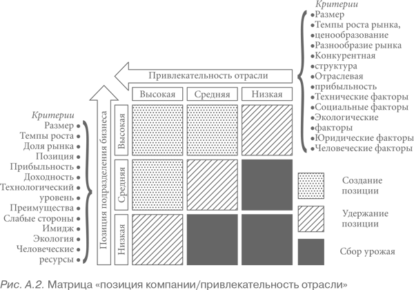 Этот аналитический метод в различных вариантах применялся фирмами General Electric, McKinsey and Company и компанией Shell. Один из его типичных вариантов представлен на схеме (рис. А.2). На осях отображены привлекательность отрасли и преимущества, или конкурентная позиция, подразделения. Пространственное положение конкретного подразделения в матрице определяется его анализом и анализом отрасли, проведенными на основе критериев, отображенных на схеме. В зависимости от этого положения его основная стратегическая задача определяется как инвестирование капитала в создание позиции, удержание позиции путем сбалансирования денежного потока, сбор урожая или выход из бизнеса. Ожидаемые изменения в привлекательности отрасли или позиции компании ведут к пересмотру стратегии. Фирма может отобразить свой портфель бизнес-единиц с помощью подобной матрицы с тем, чтобы обеспечить адекватное размещение ресурсов. Фирма также решает задачу сбалансирования структуры портфеля с точки зрения наличия в нем развивающихся и зрелых сфер бизнеса, а также соответствия между генерированием и использованием денежных средств.