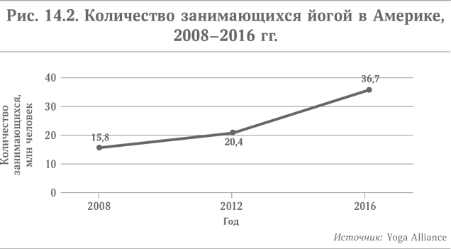 Микротренд фанатичного отношения к здоровому образу жизни идет рука об руку с увлечением медитацией и представлением о том, что, если следить за всем, что попадает в организм, можно стать не только более здоровым, но и более «просветленным». Йога, которая была уделом хиппи или поклонников восточной медицины, сегодня приобретает взрывную популярность. За период между 2008 и 2016 гг. число практикующих йогу американцев удвоилось, а количество посетивших хотя бы одно занятие йогой за последние шесть месяцев достигло 36 млн человек.