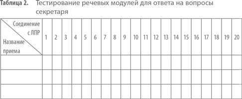 Выделите три самых подходящих для вашей сферы продаж речевых модуля для работы с вопросами секретаря, запишите их формулировки в табл. 2 и, если в ходе следующих холодных звонков блокер начнет задавать уточняющие вопросы, используйте их по очереди. «Плюсами» отмечайте случаи, в которых прием сработал, «минусами» – неудачи. Подсчитайте количество плюсов по каждому приему.