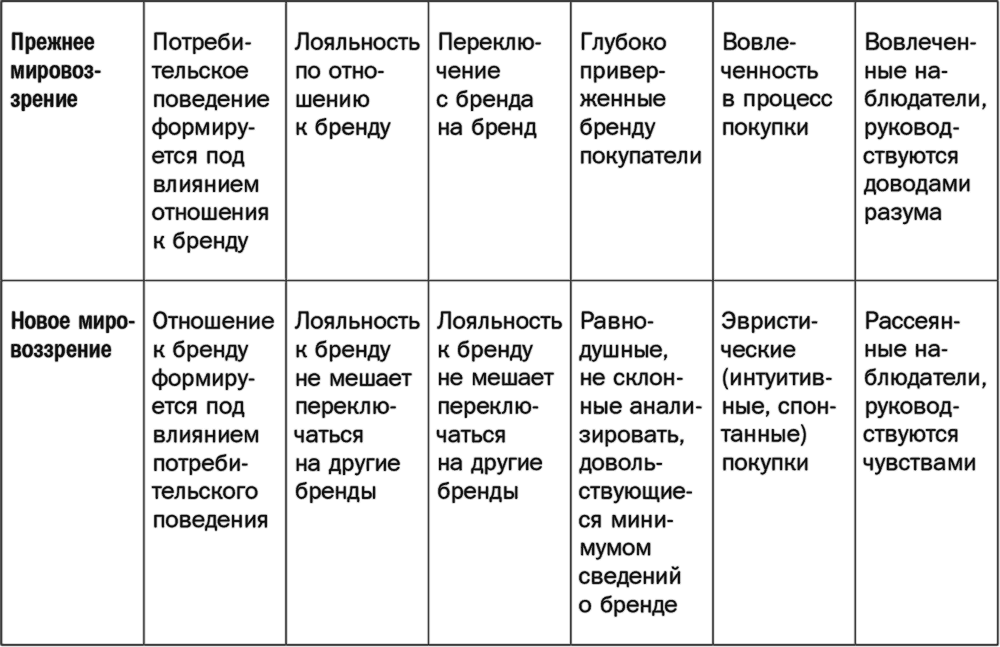 Таким образом, маркетологи должны совершенствовать брендинг[4] своего продукта (то есть бренд должен выделяться на фоне остальных) и постоянно привлекать крупные аудитории неактивных покупателей, оставаясь в рамках экономической эффективности. Маркетологам необходимо хорошо представлять, в чем заключаются значимые (характерные) активы их торговой марки (цветовая гамма, логотипы, тональность, гарнитуры шрифта и пр.); их важно беречь и применять. Кроме того, нужно ясно понимать, как люди покупают именно этот бренд, в какие моменты думают о нем или обращают на него внимание и как все это вписывается в их жизненные обстоятельства. Маркетологи должны управлять медиаразмещением и дистрибуцией товара в соответствии с этими фактами.