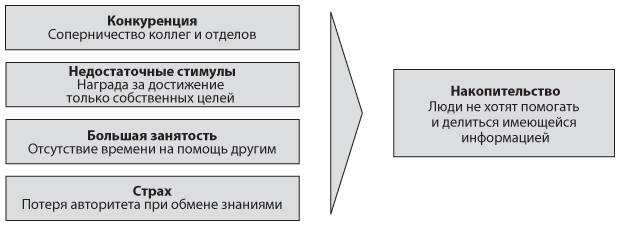 В отличие от барьера «изобретено не здесь», когда люди не хотят просить помощи у других, барьер накопительства касается противоположной категории людей: тех, кто может помочь, но не помогает. Различные факторы, ведущие к накопительству, представлены на рис. 3.2.