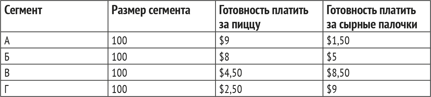 Вопрос. Представьте, что вы владеете всемирно известной пиццерией, где готовятся восхитительная пицца и сырные палочки. Вы давно уже обдумываете, как рассчитывать цену на свою продукцию. Вы проанализировали клиентскую базу и решили разделить клиентов на четыре категории, или сегмента. Сегмент А любит пиццу и готов платить за нее $9, но вполне может обойтись без сырных палочек (они готовы заплатить за них всего $1,50). Сегмент Г обожает сырные палочки и согласен платить за них $9, но не любит пиццу (готов заплатить за нее не больше $2,50). Два других сегмента, Б и В, попадают примерно между А и Г по готовности платить. Вы также выяснили, что размеры ваших сегментов одинаковые – по 100 человек в каждом. Итак, ваши цифры выглядят так: