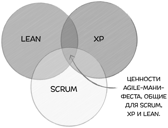 Рис. 2.5. Scrum, XP и Lean все в своей основе имеют agile-ценности и разделяют некоторые ценности, идеи и методы друг с другом
