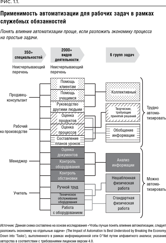 Бухгалтер, готовящий официальный отчет для регулирующих органов, использует стандартные образцы и правила выполнения работы, действуя в одиночку. Он собирает информацию из различных источников, обобщает ее, анализирует стандартными методами, не привлекая к этому других сотрудников. Такая работа может быть в значительной степени автоматизирована с помощью надежных, неоднократно опробованных методик. К примеру, имеет смысл использовать роботизированную автоматику для сбора и объединения информации, а также провести ее анализ и составить стандартный отчет с помощью искусственного интеллекта. Сотрудники колл-центров постоянно взаимодействуют с людьми. Они подстраиваются под каждого звонящего: эмоции, потребности и стиль общения клиентов уникальны. Работа, требующая взаимодействия с людьми, хуже поддается автоматизации. Однако развитый искусственный интеллект и усовершенствованные сенсоры способны распознать эмоции человека, находящегося на другом конце провода, и проанализировать запрос, предоставив сотруднику колл-центра информацию, которая поможет ему обслужить клиента более внимательно, лучше понимая его нужды.