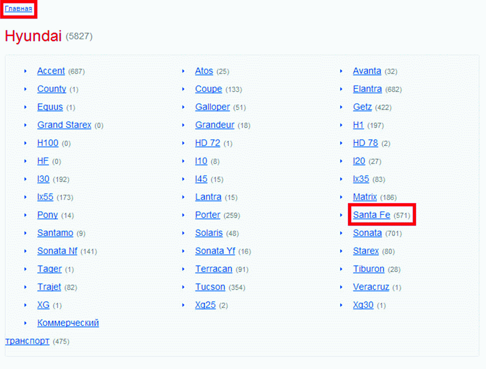 2. Страница, созданная под более конкретный запрос «Запчасти для Hyundai Santa Fe». Здесь размещен список подкатегорий и всех запчастей для автомобиля Hyundai модели Santa Fe.