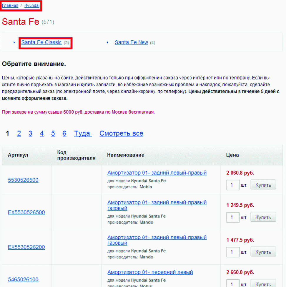 3. Страница, созданная под запрос «Запчасти на Hyundai Santa Fe Classic». На этой странице вы можете увидеть все запчасти, которые подходят именно для данного автомобиля – и, разумеется, ссылки на эти запчасти