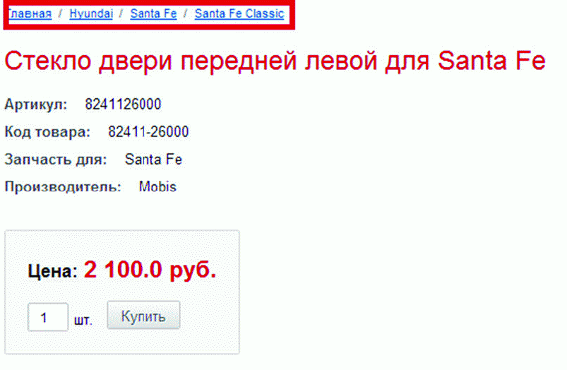 4. А вот и страница под максимально конкретный в нашем случае запрос «Стекло двери передней левой для Hyundai Santa Fe Classic». Как видите, этот запрос на определенную деталь для автомобиля определенной модели – как говорится, конкретней некуда*. И данная страница точно отвечает на этот запрос: показывает искомую запчасть и ее стоимость.