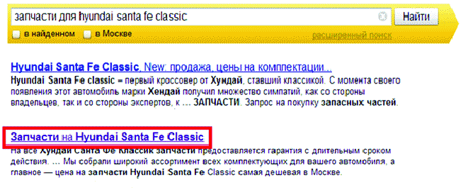 Как видите, пользователь ввел в строке поиска довольно конкретный запрос: запчасти для hyundai santa fe classic.