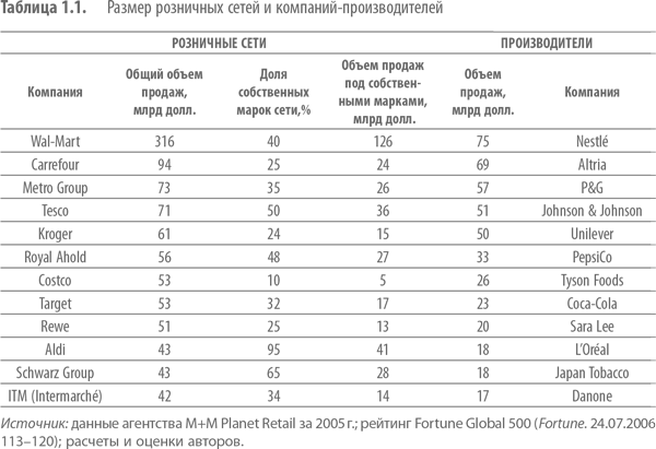 В результате роста и укрупнения розничных сетей изменился баланс сил между производителями традиционных брендов и розничными сетями. Если 25 лет назад рядом с крупными производителями фасованных потребительских товаров их клиенты, розничные магазины, казались просто крошечными, то сейчас розничные компании стали крупнее компаний-производителей. Это дает им большое преимущество, и они могут диктовать свои условия поставщикам (табл. 1.1){2}.