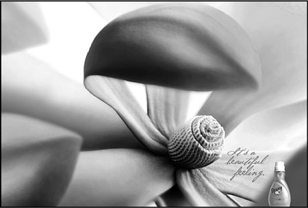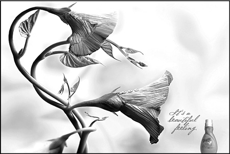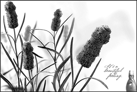 Подобный прием использовался и в рекламе кондиционера для белья. Новое средство придает ткани свежесть, нежность и аромат живых цветов (рис. 56–58). Вам осталось только добавить пару колпачков волшебной жидкости при стирке и проверить лично это невероятно соблазнительное обещание.