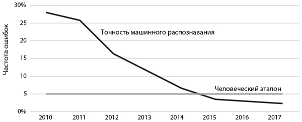 Если сравнивать первый (2010) и последний (2017) конкурсы, то прогнозы заметно улучшились. На рис. 1 приводится график точности победителей по годам. На вертикальной оси отмечена частота ошибок (поэтому чем ниже, тем лучше). В 2010 году лучшие прогностические машины неверно распознавали 28 % изображений. В 2012 году конкурсанты впервые использовали глубокое обучение, и частота ошибок снизилась до 16 %. Как отмечает профессор Принстона, IT-специалист Ольга Русаковская, «2012-й действительно стал годом огромного прорыва в точности, и это доказывает эффективность модели глубокого обучения, существующей уже несколько десятков лет»[23].