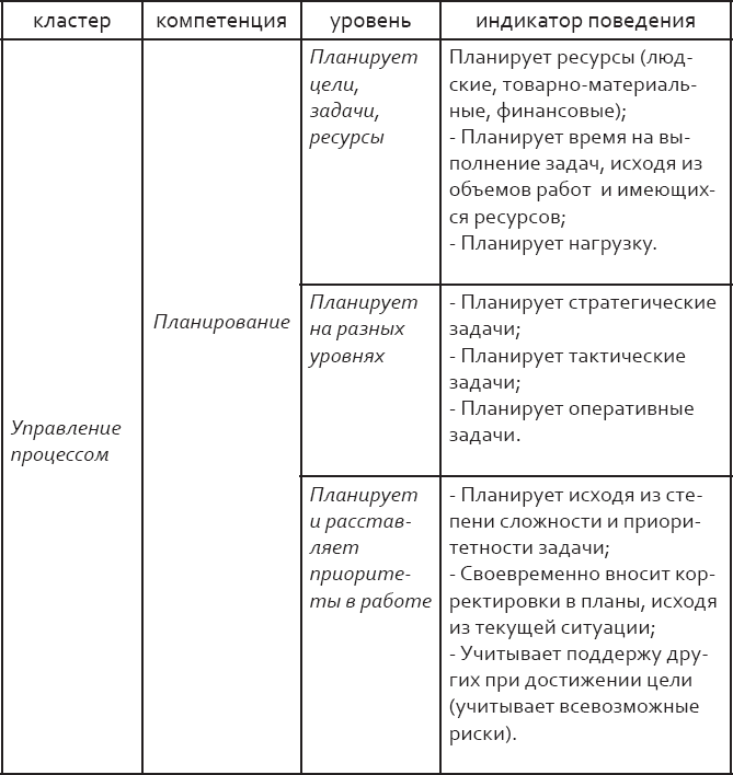 Как Вы уже успели заметить, каждая приведенная компетенция, это набор поведенческих индикаторов, объединенных в блоки (уровни), в зависимости от смыслового объема. Количество уровней может быть разным, исходя из компетенции (обычно от 2 до 5).