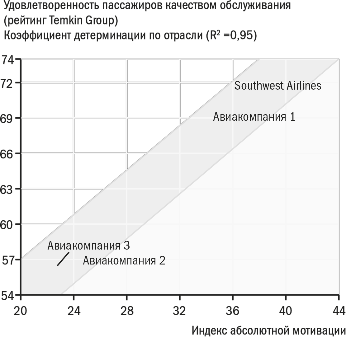 Рис. 6. Более высокий индекс абсолютной мотивации в компании Southwest Airlines сопровождается и более высоким уровнем удовлетворенности пассажиров