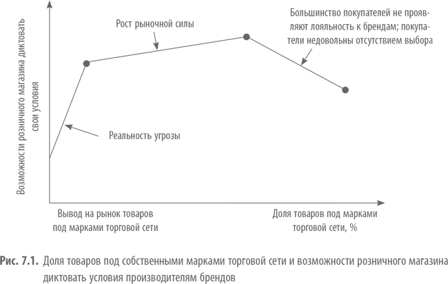 Сам факт выхода на рынок товаров той или иной категории под маркой торговой сети может значительно повлиять на результаты переговоров об условиях поставок между розничной сетью и производителями традиционных брендов, даже в том случае, если доля товаров под маркой розничного магазина невелика{139}. Бренд розничного магазина становится «реальной угрозой» для традиционных брендов, так как магазин имеет все средства для продвижения собственного бренда: рекламные листовки, экспозиция внутри магазина, выделение собственным брендам больше места на полках за счет товаров традиционных брендов. Однако товары под марками торговых сетей составляют реальную угрозу только в том случае, если товар под маркой розничного магазина действительно вышел на рынок, т. е. розничный магазин уже несет значительные фиксированные издержки. Иными словами, пока магазин только грозится вывести на рынок товары под собственными марками в той или иной категории, эти угрозы всерьез не воспримут; только действительный вывод товара на рынок дает магазину преимущества на переговорах с производителями традиционных брендов и возможность добиться для себя более выгодных условий поставок.