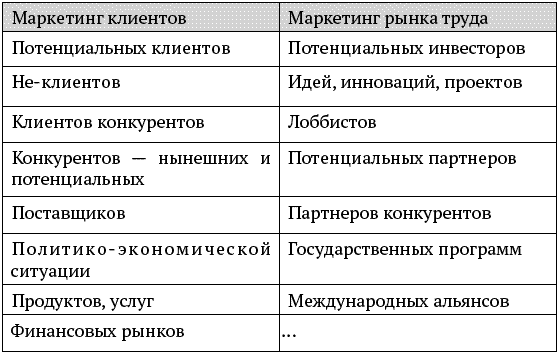 Объем и направленность книги не позволяют слишком углубиться в проблемы маркетинга, но не могу не сказать о том, что, кроме маркетинга рынка, клиентов и новых технологий, есть еще множество разновидностей маркетинга, которые я свел в таблицу: