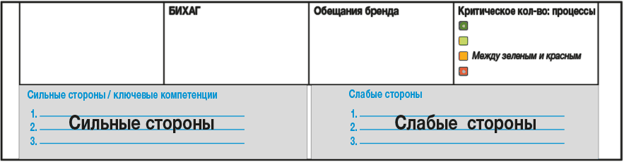 В нижней части ОСП располагается раздел, посвященный трем основным сильным сторонам, слабым и компетенциям компании. Здесь же можно составить список из шести главных тенденций, способных повлиять на компанию или всю отрасль, в которой она работает. Все эти факторы служат основанием, на котором строится видение компании. Далее мы расскажем о новом инструменте для SWT-анализа, который поможет в заполнении этого раздела. Он представляет собой обновленную версию старого доброго SWOT-анализа, который компании используют уже многие десятилетия.