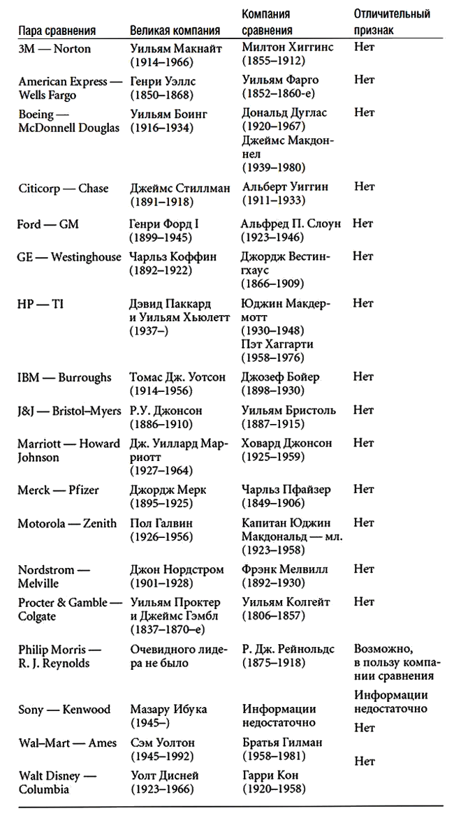ПРИМЕЧАНИЕ. При выборе дат мы старались охватить весь период времени, в течение которого тот или иной руководитель продолжал оказывать влияние на компанию. В некоторых случаях один и тот же руководитель назывался по-разному — CEO, президент, председатель совета директоров, генеральный директор. Смысл этой таблицы состоит в том, чтобы продемонстрировать, что на стадии становления и великие компании, и компании сравнения располагали подобными руководителями, и, следовательно, определенное таким образом лидерство не является существенным признаком.