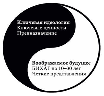 Истинное видение состоит из двух основных компонентов — ключевой идеологии и воображаемого будущего. Обратите внимание на прямую параллель с основополагающей динамикой «сохранения сути / стимулирования прогресса». Хорошее видение строится на взаимодействии этих дополняющих друг друга сил инь-ян: оно определяет, «ради чего мы существуем и что значим», что не меняется (ключевая идеология), и устанавливает, «кем мы хотим стать, чего добиться, что создать», что требует серьезных изменений и существенного прогресса (воображаемое будущее).
