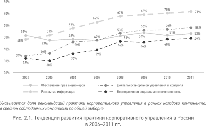 Общая картина внедрения рекомендаций CGBP в практику российских компаний в разрезе компонентов за период 2004–2011 гг. приведена на рис. 2.1.