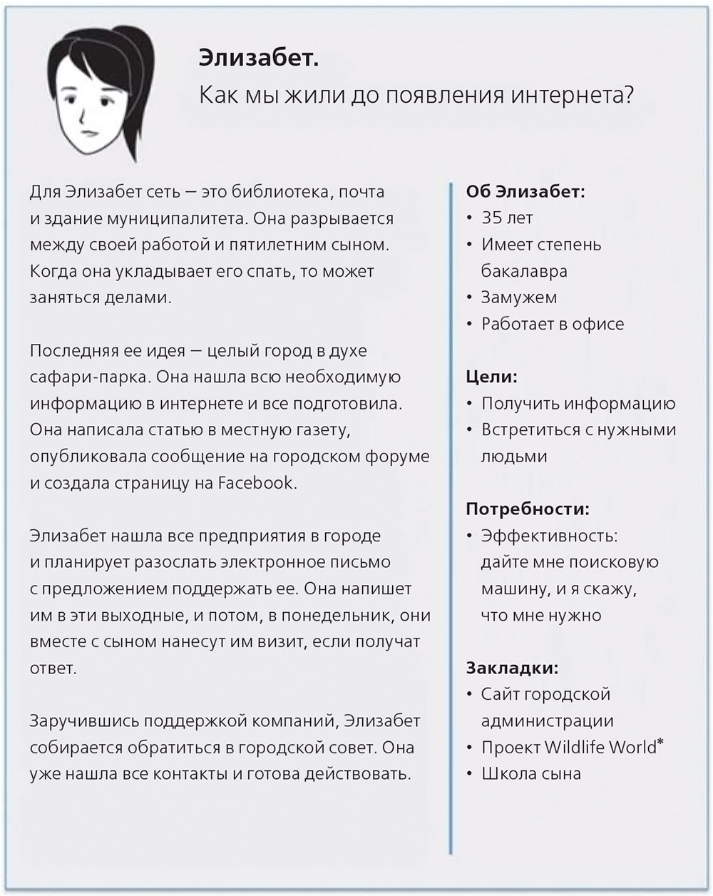 Информация об опыте пользователей в истории – отличный способ рассказать о вашей работе. Персонаж может олицетворять группу людей со схожими интересами. Комбинация разных сведений о пользовательском опыте – больше чем простая сумма слагаемых. Связи между отдельными его элементами подтверждают выводы и показывают, что вы понимаете нужды пользователей.