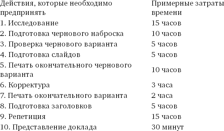 Она продемонстрирует вам не только наилучший образ действий от начала до конца, но и примерную продолжительность каждого шага вашего пути. Представленный ниже пример, взятый из книги Make Every Minute Count («Веди счет каждой минуте») Харлан Лэйн и Кристиан Уэйзер, демонстрирует временн?й график подготовки доклада на конференцию: