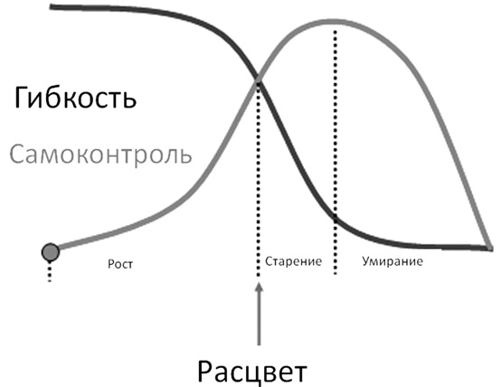 Это наводит на следующую мысль: то, развивается организация или разлагается, растет или стареет, не зависит от ее размера или возраста. Ее местоположение в жизненном цикле определяют два фактора: организационная гибкость и организационный самоконтроль. Гибкость — это функция (Е), а самоконтроль — (А).