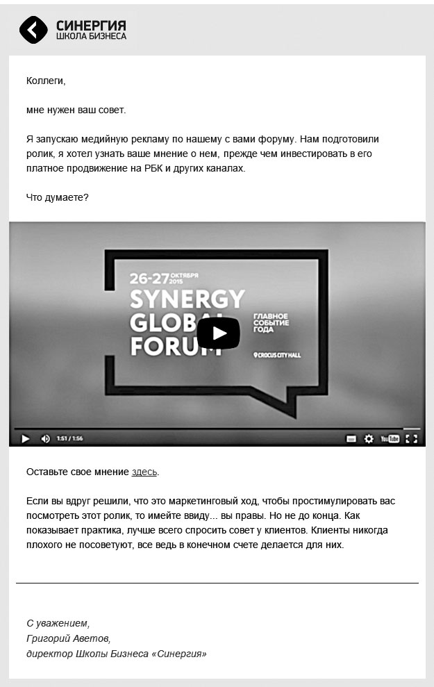 Рисунок 28. Просьба оценить рекламный ролик Синергии.
