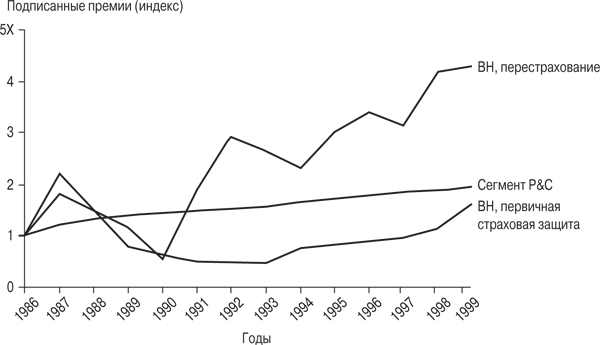 Рис. 8.2. Страховые премии Berkshire Hathaway росли быстрее, чем в целом по отрасли. Источник: данные о сегменте P&C из статистических отчетов Best’s P&C Insurance Aggregates and Averages – общее количество подписанных премий; данные Berkshire Hathaway из годовых отчетов