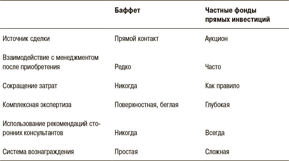 Другой важной статьей расходов Berkshire были покупки частных компаний. Этот канал незаметно стал главным для Баффета за последние 20 лет, достигнув кульминации в начале 2010 года при заключении сделки с Burlington Northern. Подход Баффета к приобретениям уникален; сравнить его с подходом частных фондов прямых инвестиций позволяет табл. 8.2.
