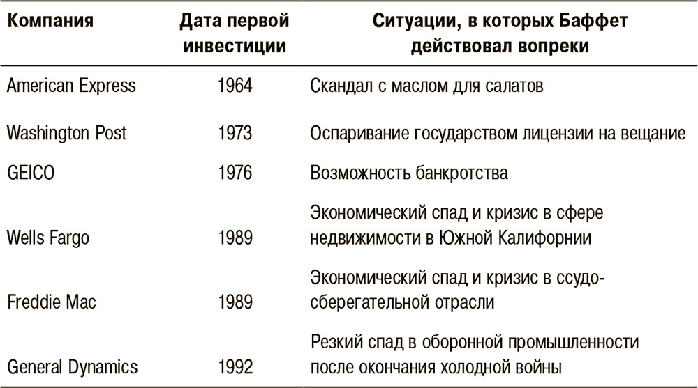 Первый – это глубоко укоренившийся дух противоречия. Баффет часто приводит в пример аналогию с «господином Рынком», которую любил использовать Бенджамин Грэхем. Эта история гласит: «Каждый день к вам приходит господин Рынок, предлагая купить у вас долю или продать вам еще бумаг… и чем более депрессивно настроен этот парень, тем больше возможностей у инвестора»[56]. Баффет систематически совершал покупки именно в моменты особого пессимизма «господина Рынка». Б?льшая часть инвестиций Berkshire на открытом рынке сделана в результате некоего кризиса индустрии или компании, который затмил стоимость основного бизнеса. Следующая таблица демонстрирует этот принцип.