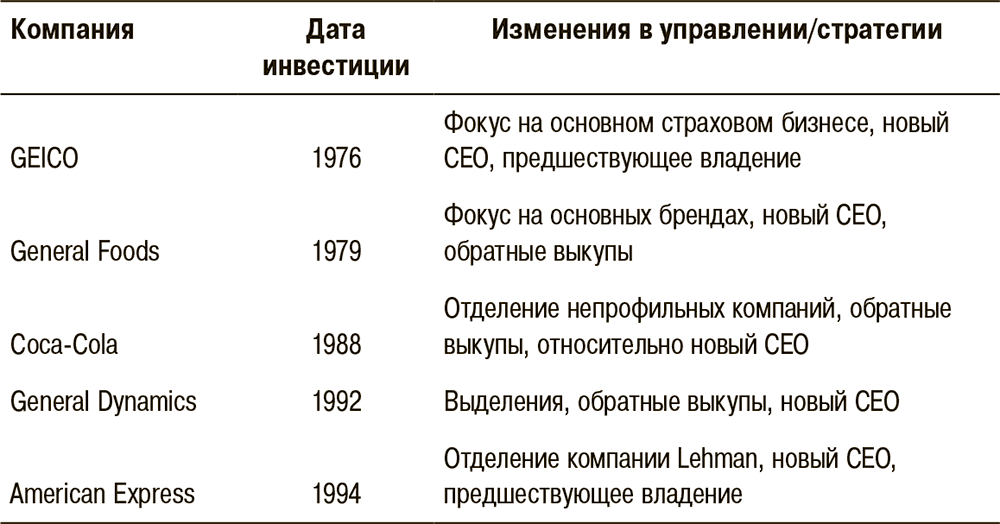 Схема инвестиций Баффета в Berkshire напоминала схему операций по принятию на страхование в его страховых филиалах – с долгими периодами бездействия, перемежающимися редкими крупными инвестициями. Пять ключевых позиций в портфеле Berkshire, как правило, составляли значительные 60–80 % общей стоимости против 10–20 % в типичном портфеле взаимного фонда. По крайней мере в четырех случаях Баффет инвестировал более 15 % балансовой стоимости Berkshire в акции одного эмитента, а однажды инвестировал 40 % товарищества Buffett Partnership в American Express.