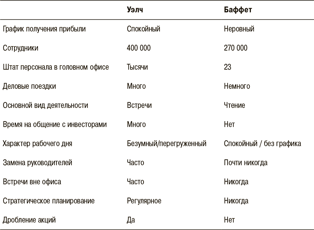Итак, как же Баффет добился столь впечатляющих результатов? За его добродушной внешностью скрывается очень неординарная личность. Пожалуй, его достижения лучше всего рассматривать в сравнении с Джеком Уэлчем (см. табл. 8.3), возглавлявшим GE и делавшим акцент на разных стратегических инициативах («шесть сигм» и других), перестановках СЕО и бешеном ритме деловых поездок и коммуникаций. Контраст в их стилях управления разителен, хотя Баффет глубоко восхищается Уэлчем.