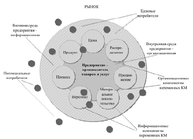 Целевые потребители, на которых ориентирована маркетинговая деятельность предприятия, находясь во внешней информационной среде, взаимодействуют с информационными компонентами переменных комплекса маркетинга. В случае их удовлетворенности распространяемой предприятием маркетинговой информацией, они переходят в организационную среду, взаимодействуя с продукцией или услугами – т. е. переходят к их приобретению и потреблению (эксплуатации). Следовательно, состав переменных комплекса маркетинга предприятий должен определяться, в первую очередь, целевыми потребителями, а их информационное наполнение такими факторами, как вид продвигаемого товара или оказываемой услуги, особенности рынка, сезонный фактор и др.