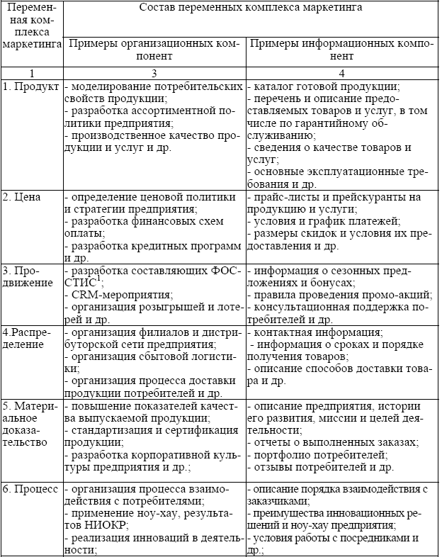 Состав организационных и информационных компонент переменных комплекса маркетинга [106]