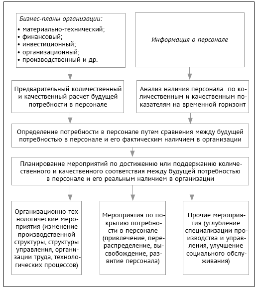 Таким образом, менеджмент должен определить будущие потребности организации в персонале; проанализировать ее реальный трудовой потенциал и, наконец, организовать мероприятия по удовлетворению потребностей в необходимых человеческих ресурсах.